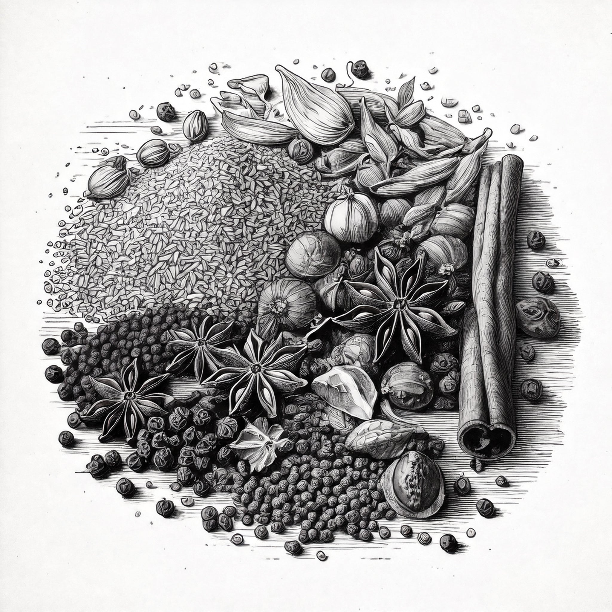 Pumpkin husk and oak moss beneath it all. Dark earth. Distant incense. The weight of the year turning.